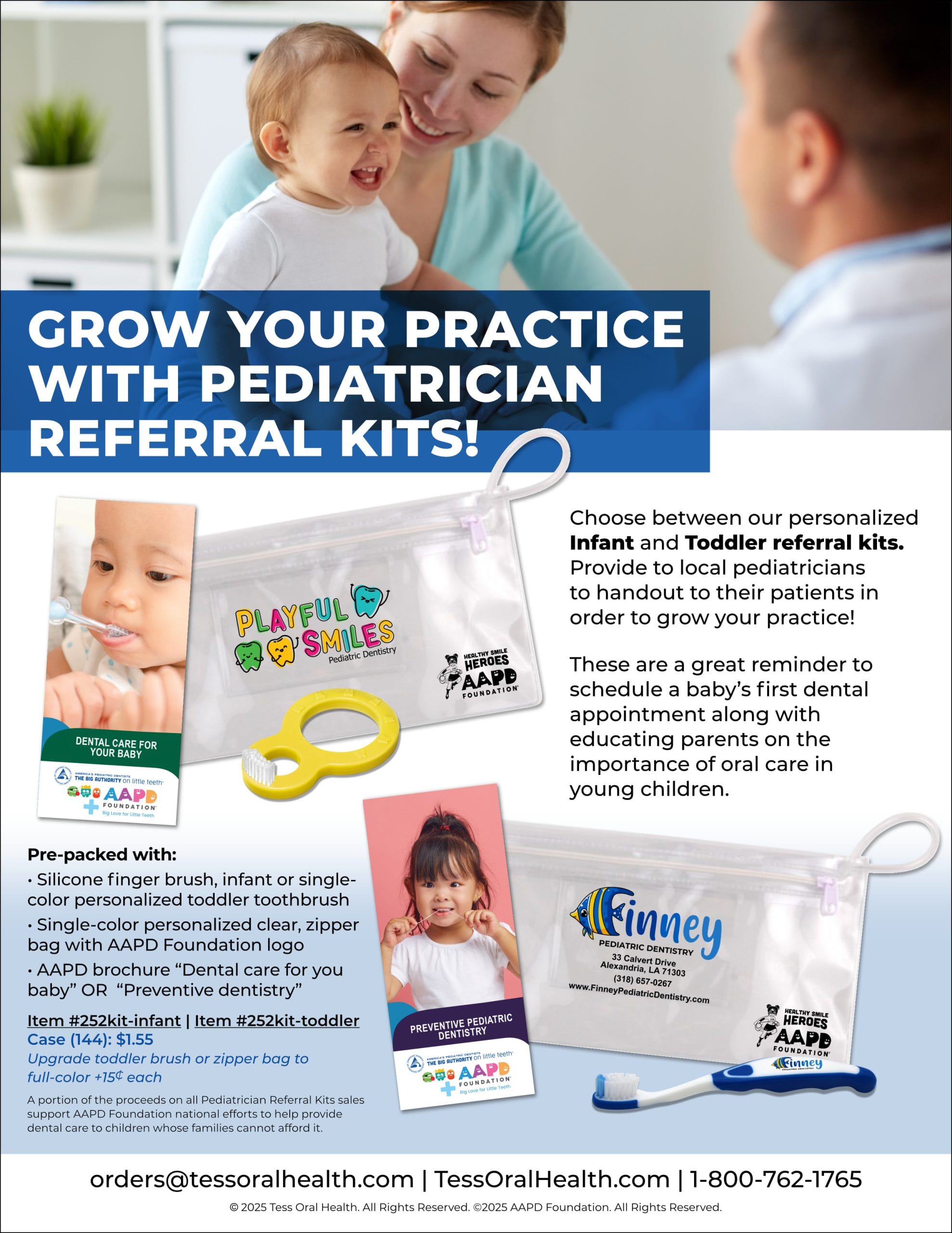 We love the referral kits that we get from Tess Oral Health! The educational brochure is a great asset to give to parents and doctors who are unsure of when to bring their child to the dentist. The referral kits are a great promotional tool as well, since the pouch and toothbrush can be personalized, and it offers a place for you to insert your business card! This kit has been very instrumental in the growth of our practice! We would recommend this product to anyone looking to promote their practice or as an educational tool!!